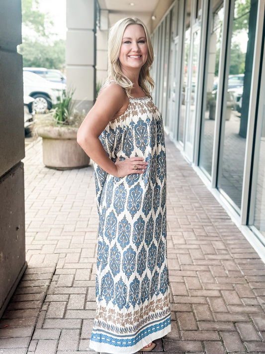 KLd "Silas" Border Print Maxi Dress-Blue/Tan