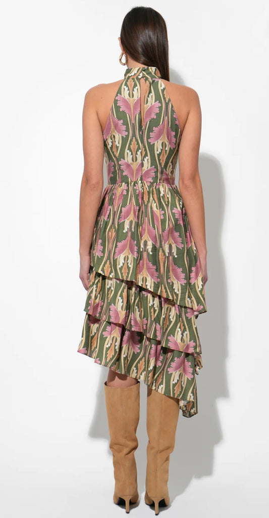 Adelyn Rae "Chriselle" High Neck Tiered Floral Midi Dress-Olive Multi