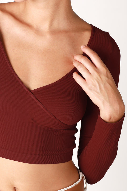 Niki Biki Ribbed Surplice Crop Top-Sundried Tomato