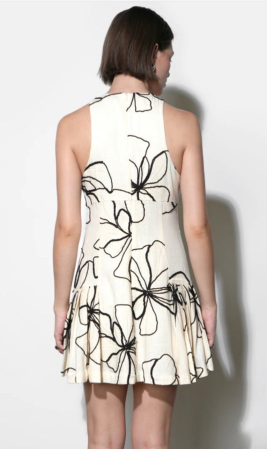 Greylin "Madeline" Large Embroidery Floral Pleated Mini Dress-Ivory/Black
