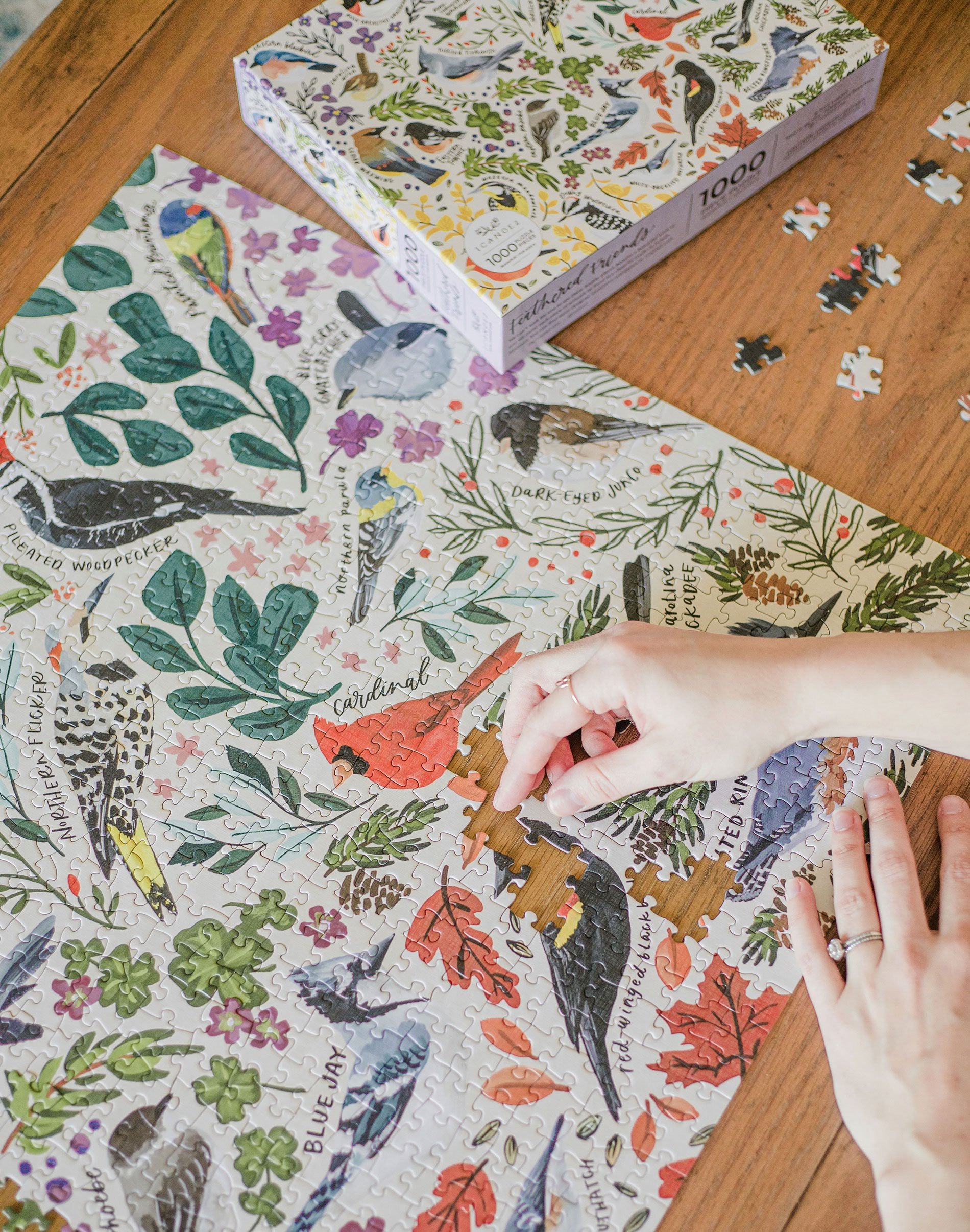 Our birds puzzle makes the perfect gift for Mother's Day and Father's Day or for any bird watcher or nature lover. It features a variety of beautifully hand-painted birds such as the blue jay, goldfinch, cardinal, chickadee, eastern bluebird (our state bird!), hummingbird, wren, a few woodpeckers, and more! Each species' name is hand-lettered—making this puzzle a fun and educational activity for kids and adults.