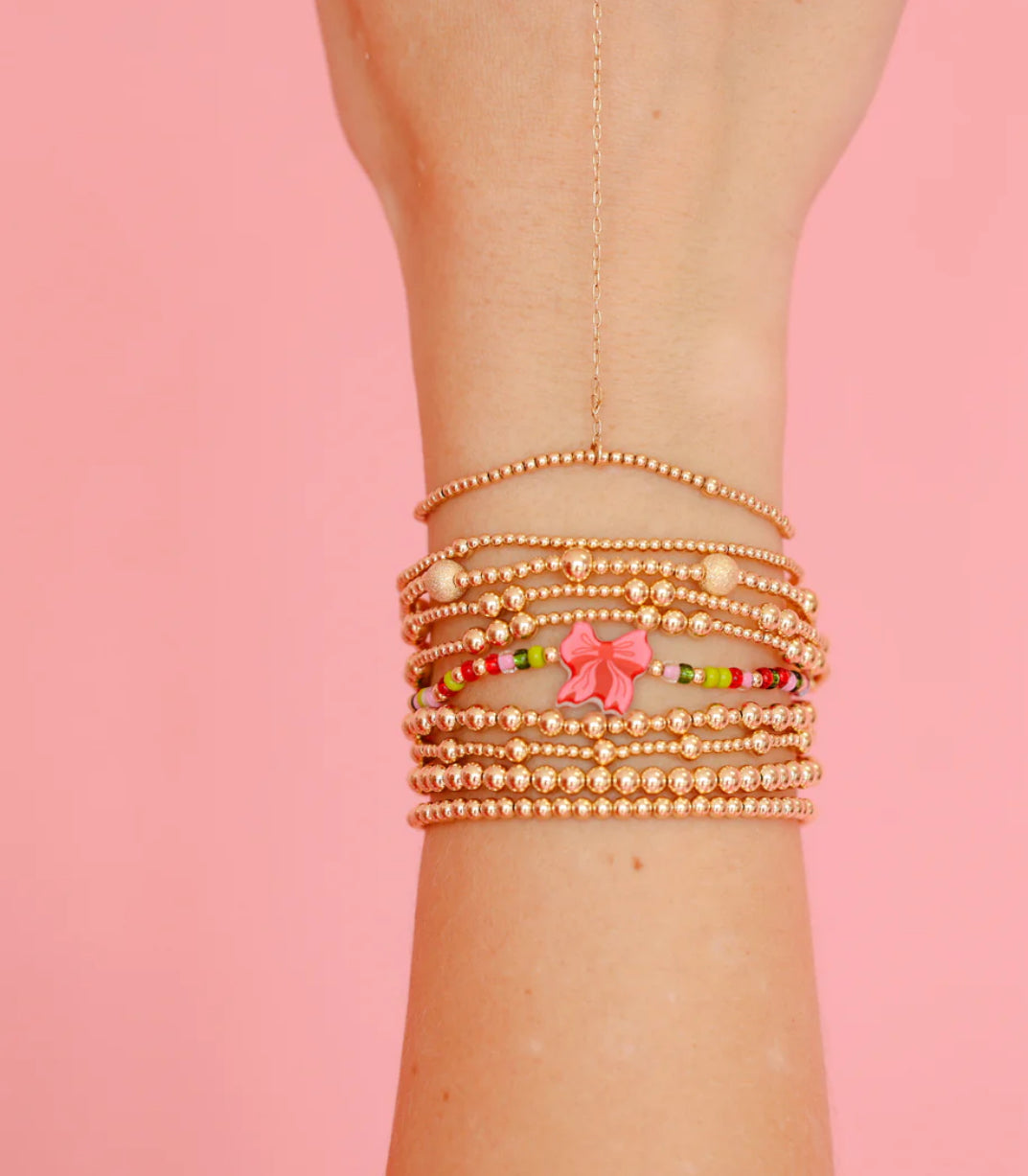 Part of the Beaded Blondes Holiday Collection. Our Red Bow Holiday Bracelet is on sprinkle making it perfect to add to your stack for the holidays.