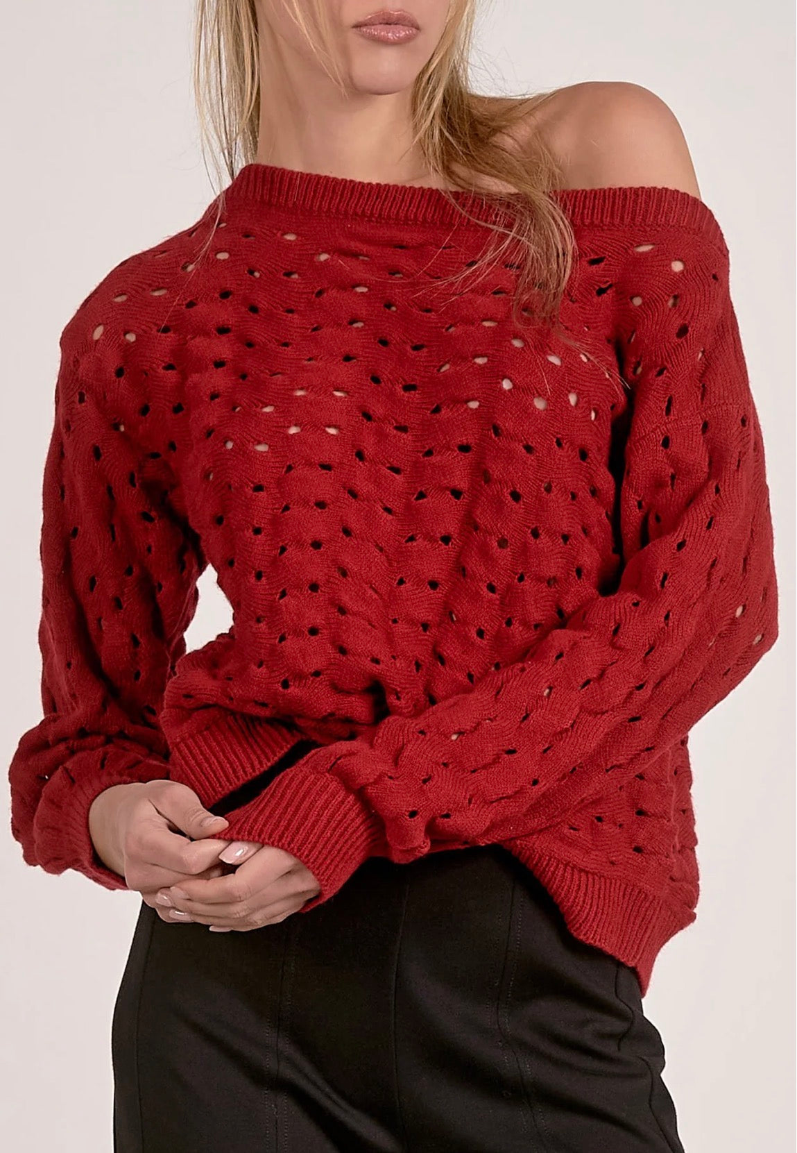Elan Wide Neck Open Knit Sweater-Red