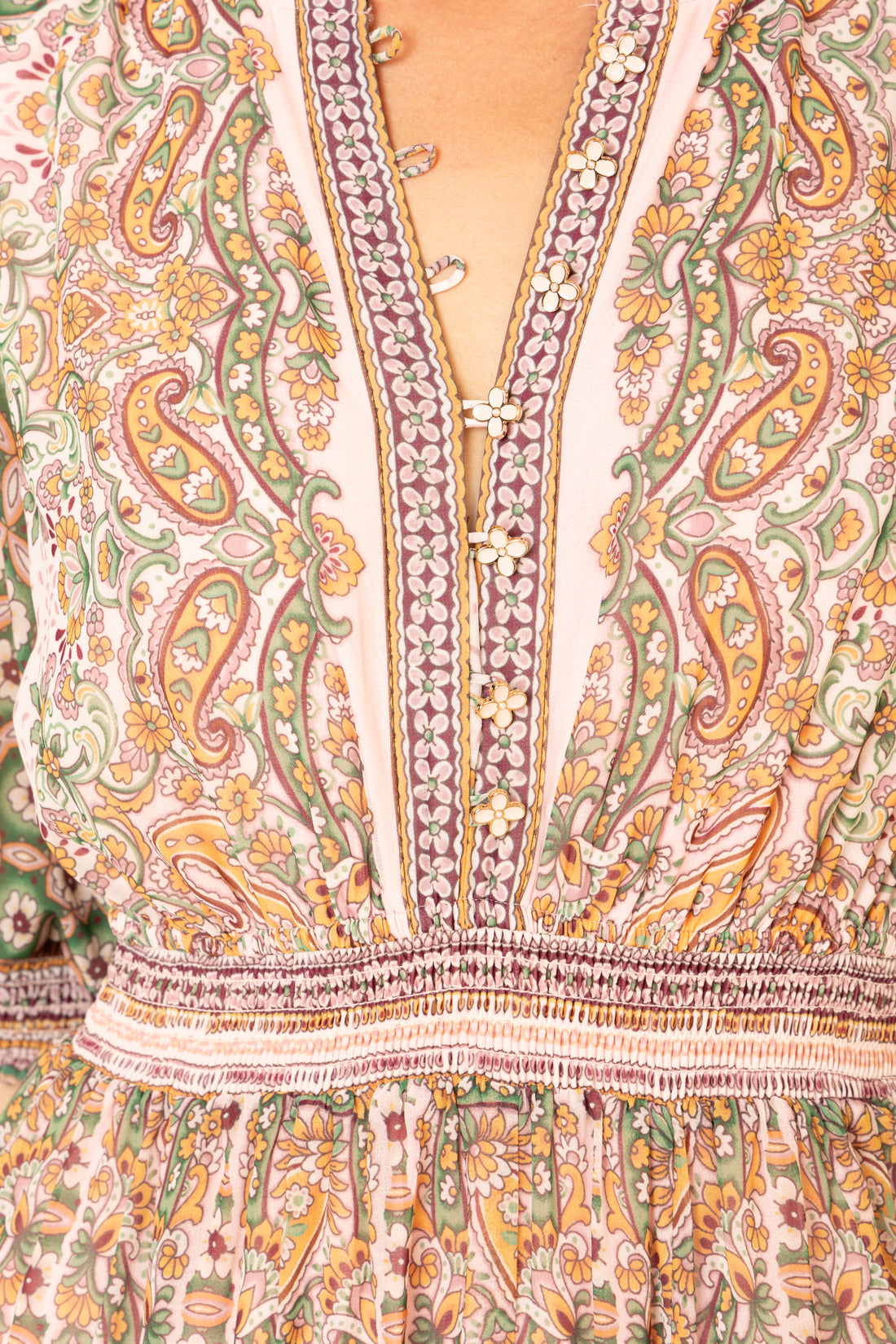 Long sleeved, v-neck lined maxi dress with pockets in side seam. Metal flower button detailing.