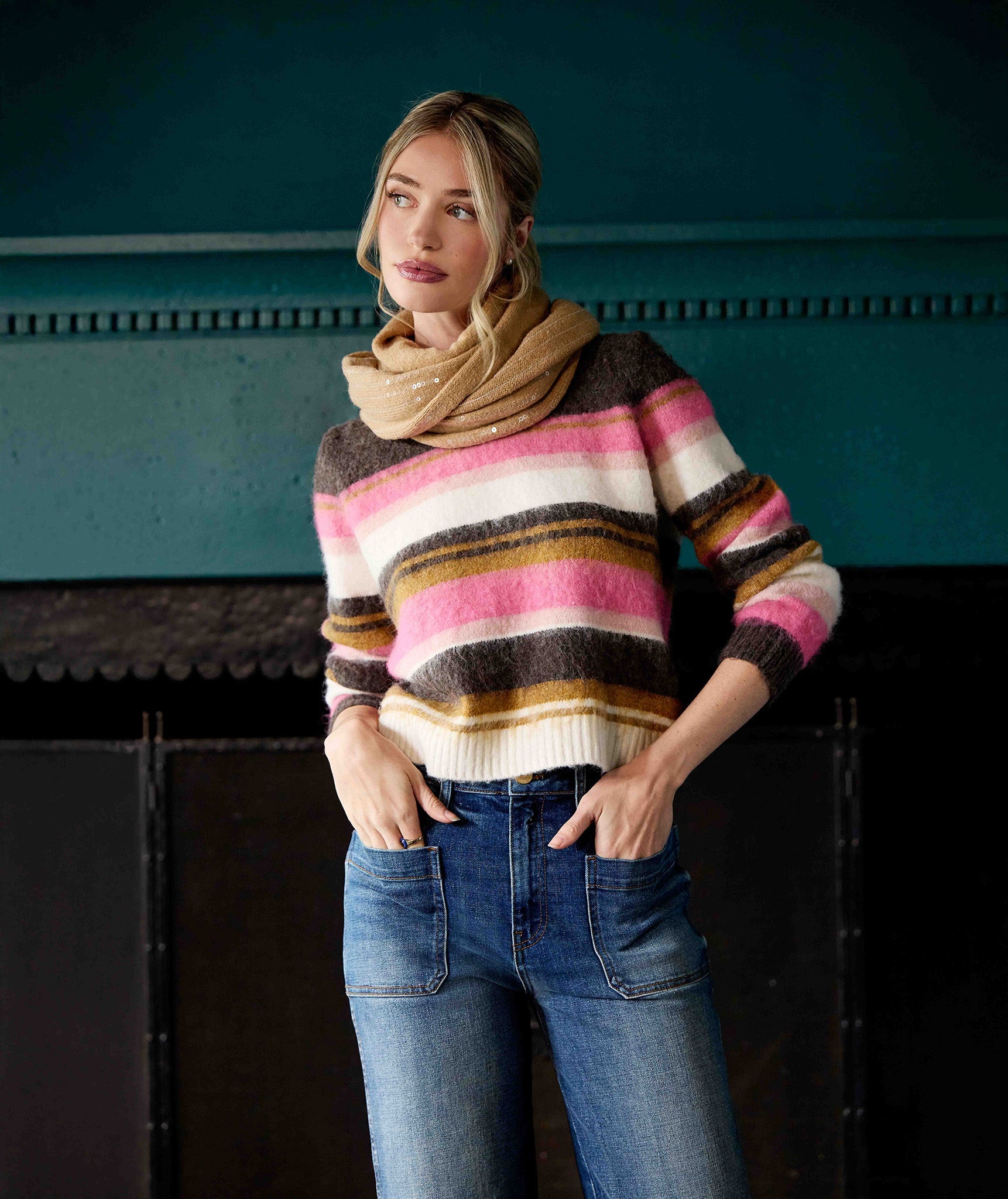 A wooly texture brings ultracozy vibes to this striped sweater knit with a slouchy fit and warming ribbed trim.