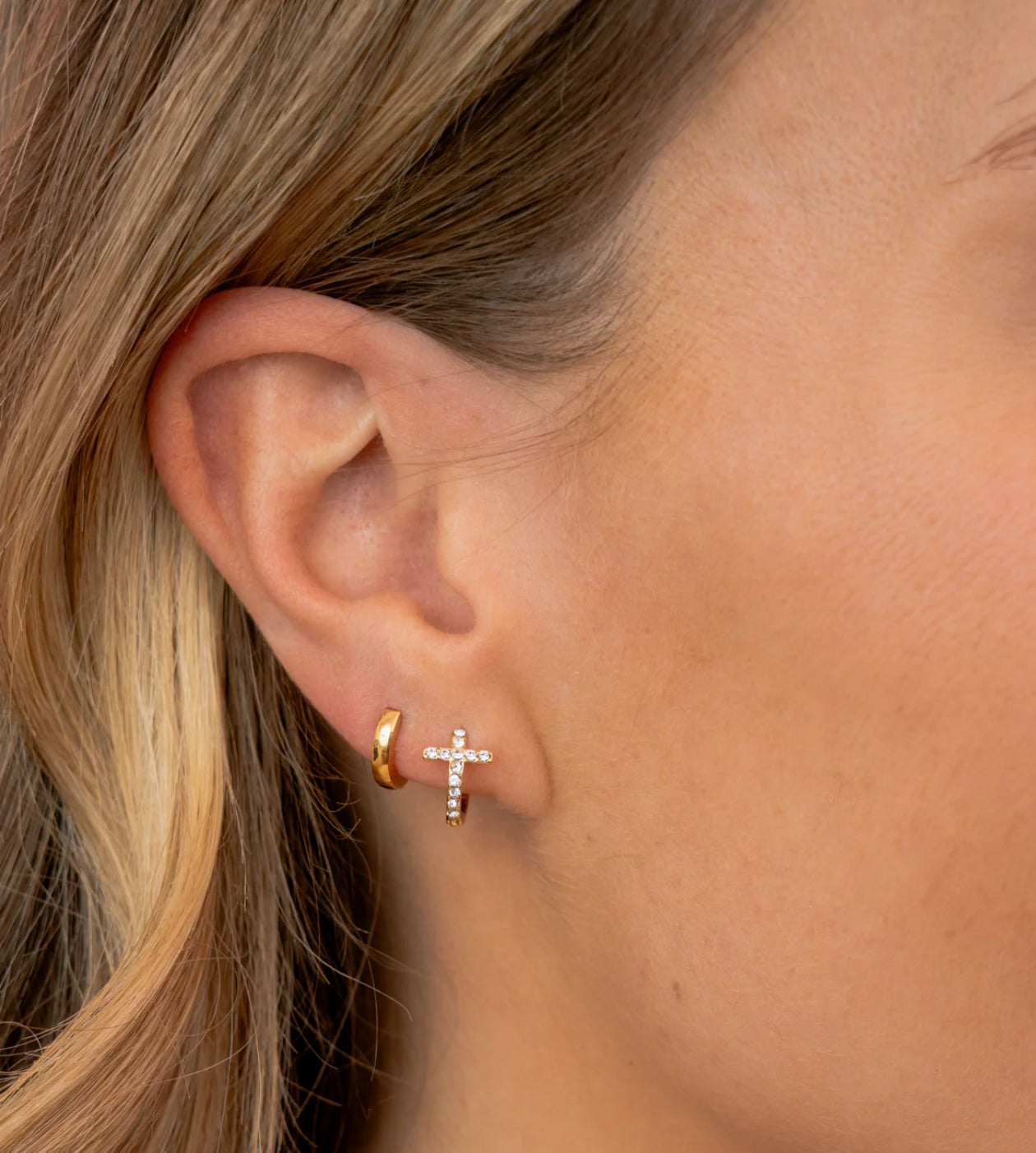 Add a touch of timeless sparkle with our Cross Huggie Earrings. Crafted for everyday elegance, these gold plated huggies feature a delicate cross charm adorned with shimmering cubic zirconia. Lightweight and perfect for layering, they bring effortless style to any ear stack. A meaningful and stylish addition to your jewelry collection.