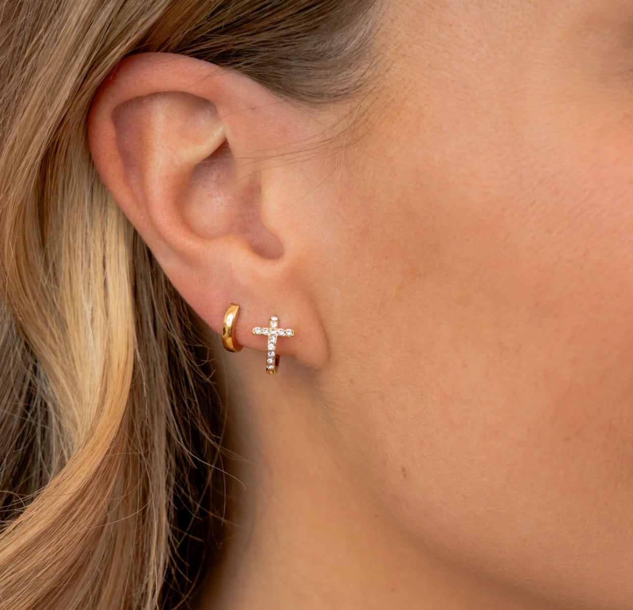 Add a touch of timeless sparkle with our Cross Huggie Earrings. Crafted for everyday elegance, these gold plated huggies feature a delicate cross charm adorned with shimmering cubic zirconia. Lightweight and perfect for layering, they bring effortless style to any ear stack. A meaningful and stylish addition to your jewelry collection.