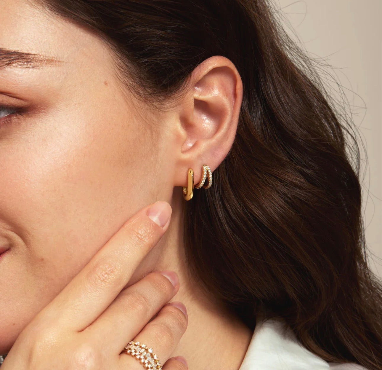 Sleek, sculptural, and effortlessly chic. Our Piper Paperclip Huggies feature a smooth, rounded silhouette with a subtle beveled edge that catches the light beautifully. Crafted in 14k gold-plated brass with a protective e-coating, these modern huggies bring timeless polish to your everyday look.