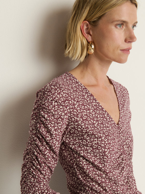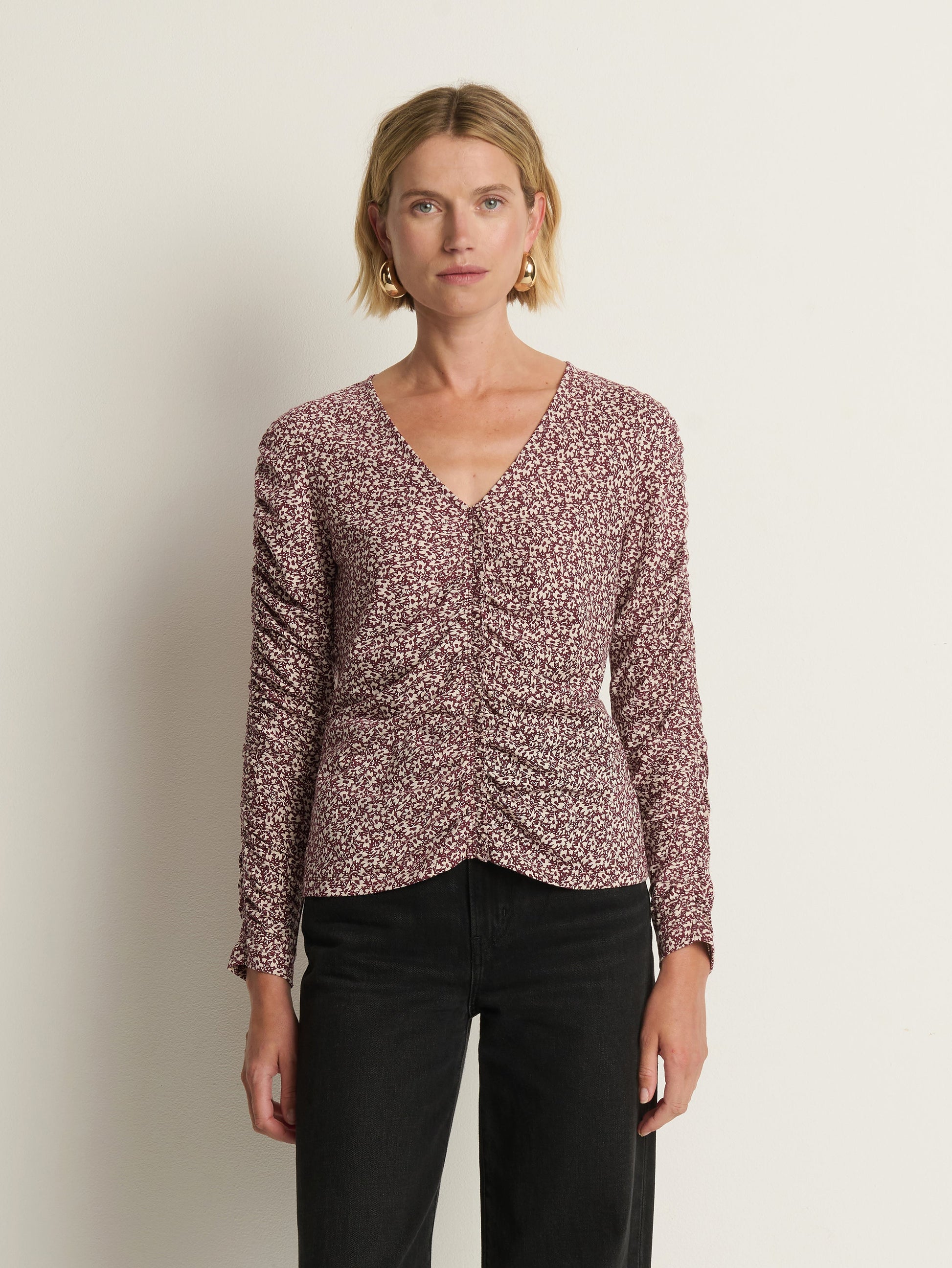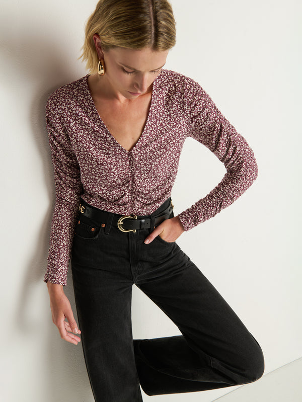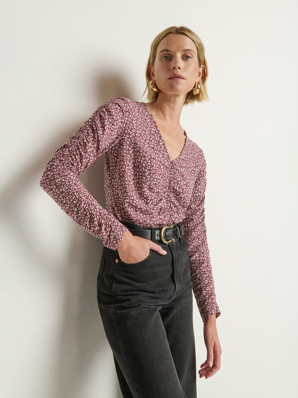 The Colette Tee is a refined essential with a feminine edge—crafted from luxe jersey in a fitted silhouette. Subtle gathers, a V-neckline, and long sleeves bring shape and softness. Ideal for tucking into one of our Italian-made leather belts.