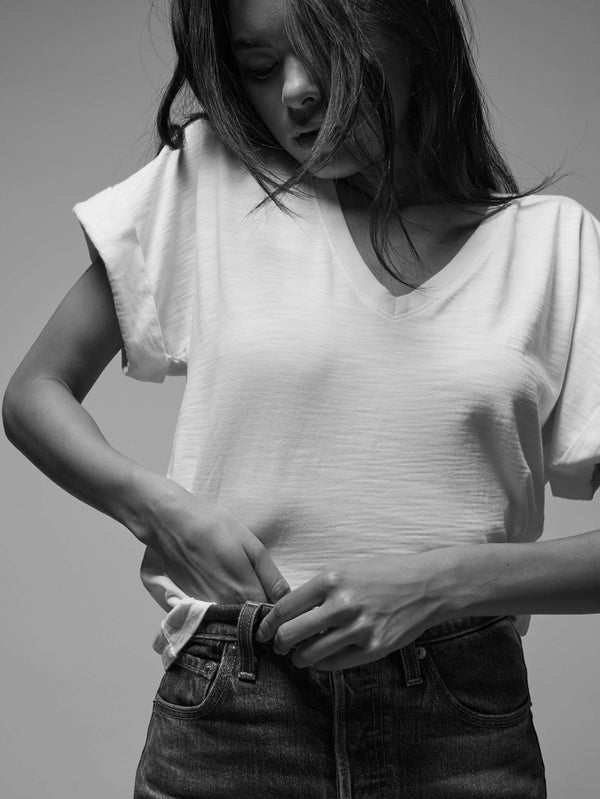 We elevated your everyday V neck with rolled boxy sleeves and an easy, relaxed silhouette. You’re welcome. (This one comes in Optic White.)