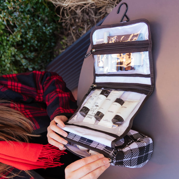 A GORGEOUS TRAVEL COMPANION TO HANG OUT WITH. Multifunctional is best when it comes to toiletry bags. Whether you're on the go, or using products at home, a hanging option is essential to convenient storage. Simply fold and roll this bag up (like a burrito) when the hanger is not in use. The clear compartments make finding what you need fast.