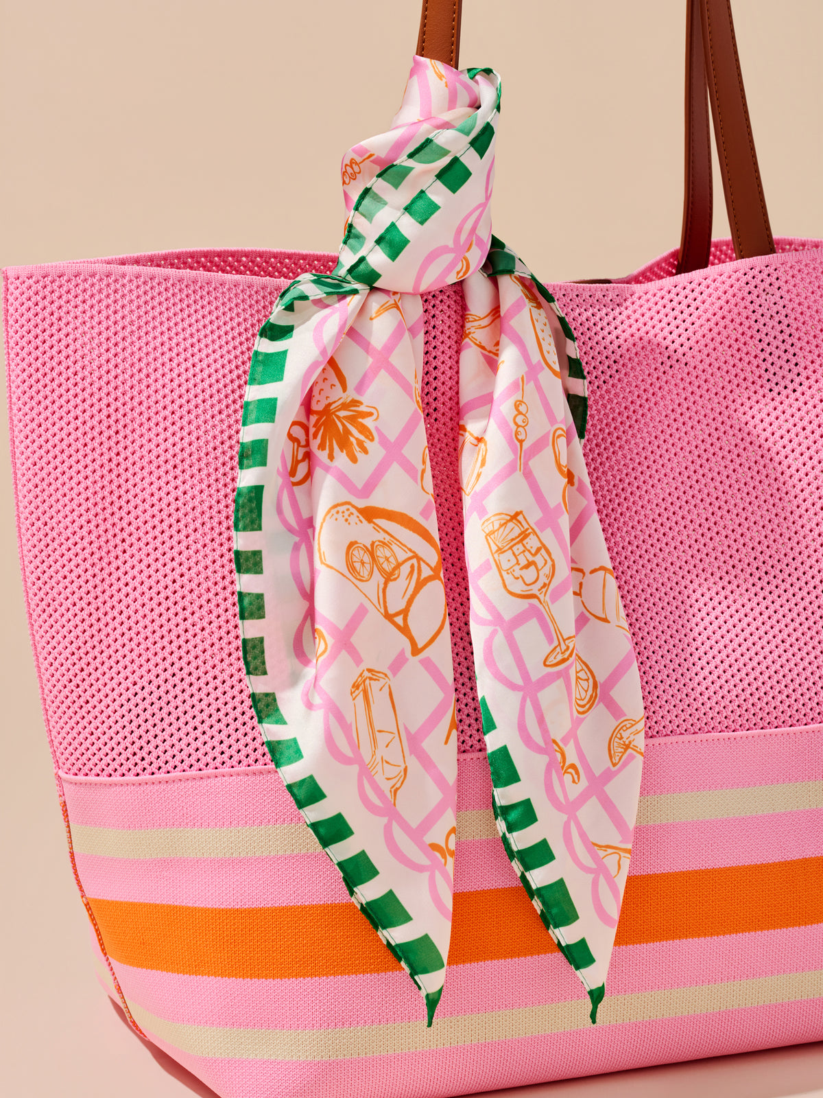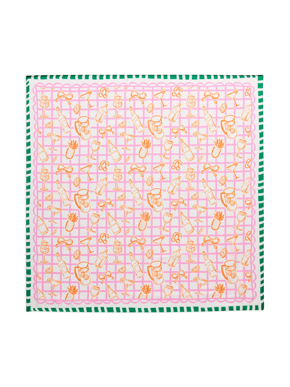 Add a splash of fun to your summer accessories with the Spritz Scarf. This silky square scarf features a playful cocktail-themed print in sunny orange, punchy pink, and fresh green hues. With tropical drinks, pineapples, and citrus slices dancing across a pink grid background, it’s the perfect pop of color for beach bags, ponytails, or neck ties. Lightweight and versatile, this scarf instantly turns any outfit into a celebration.