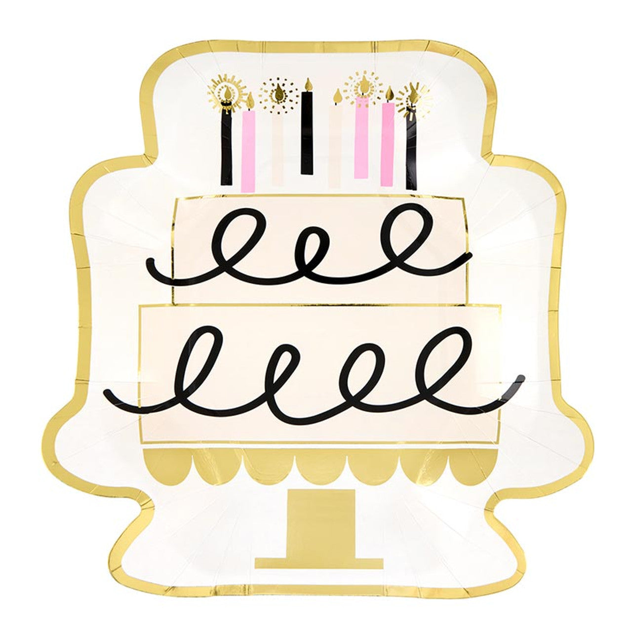 Make birthdays sweeter with our cake-shaped plates, featuring a playful candle design and elegant gold foil rim.