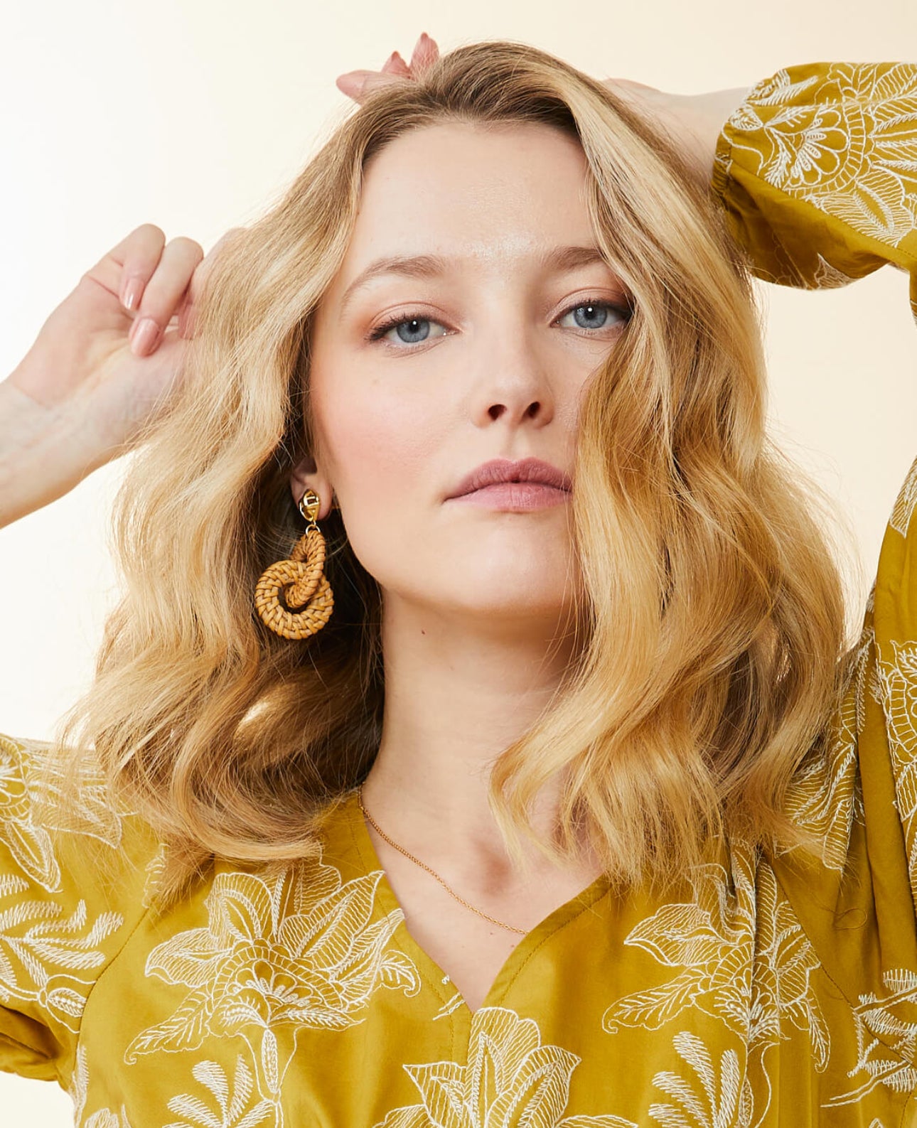 A woven cane pattern stud of 18kt matte gold plating tops lightweight woven wicker rings to create a one-of-a-kind look in our Cane Wicker Ring Earrings.