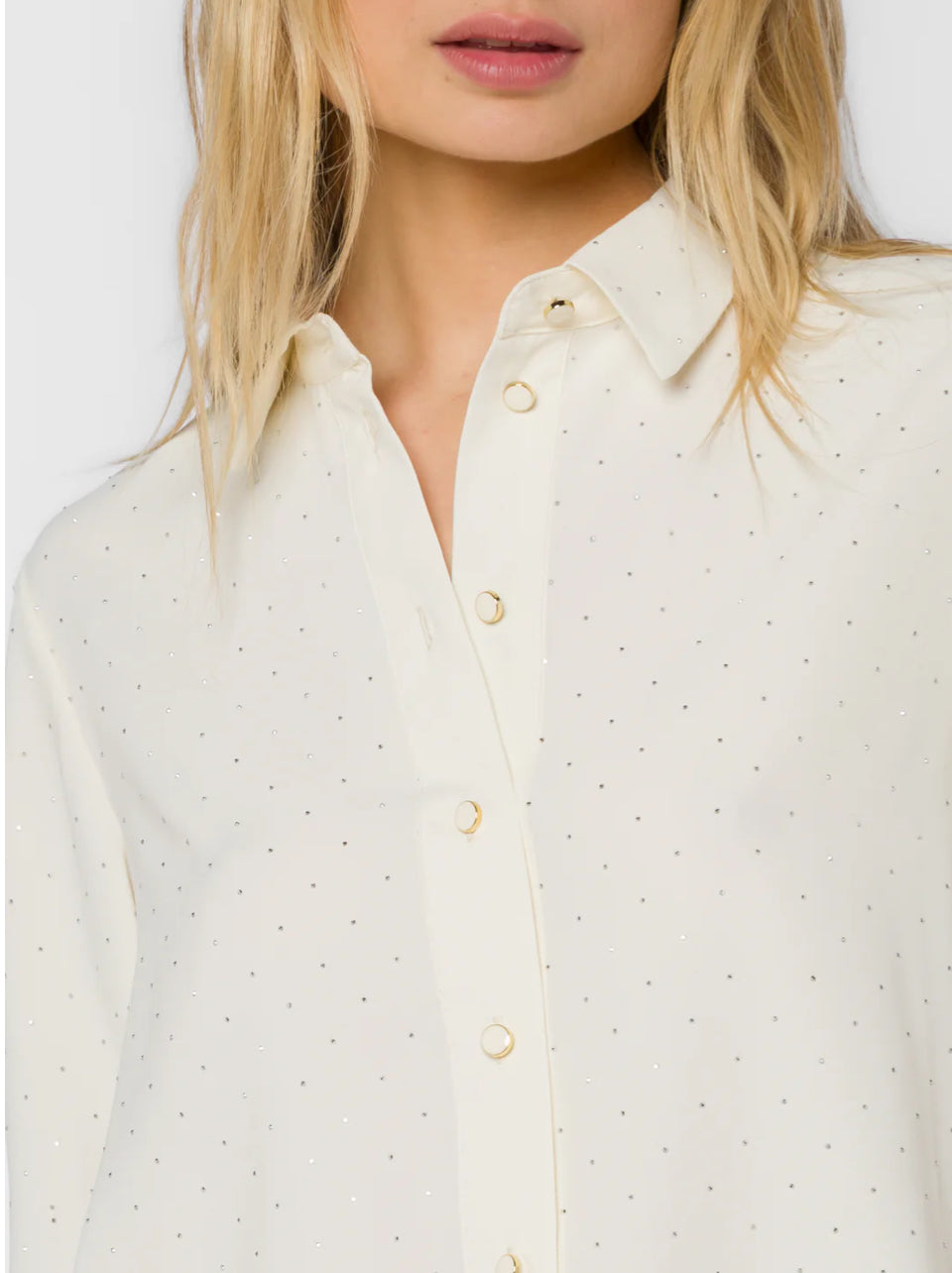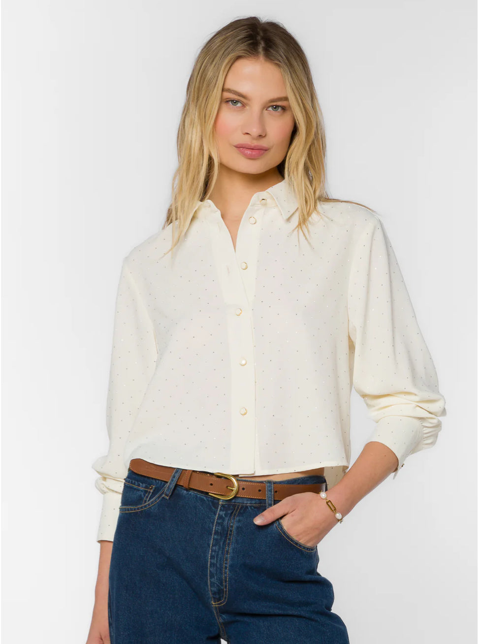 This collared cropped button-up shirt features long sleeves with button cuffs, all-over rhinestone detailing, and is crafted from a lightweight material with a flowy feel.